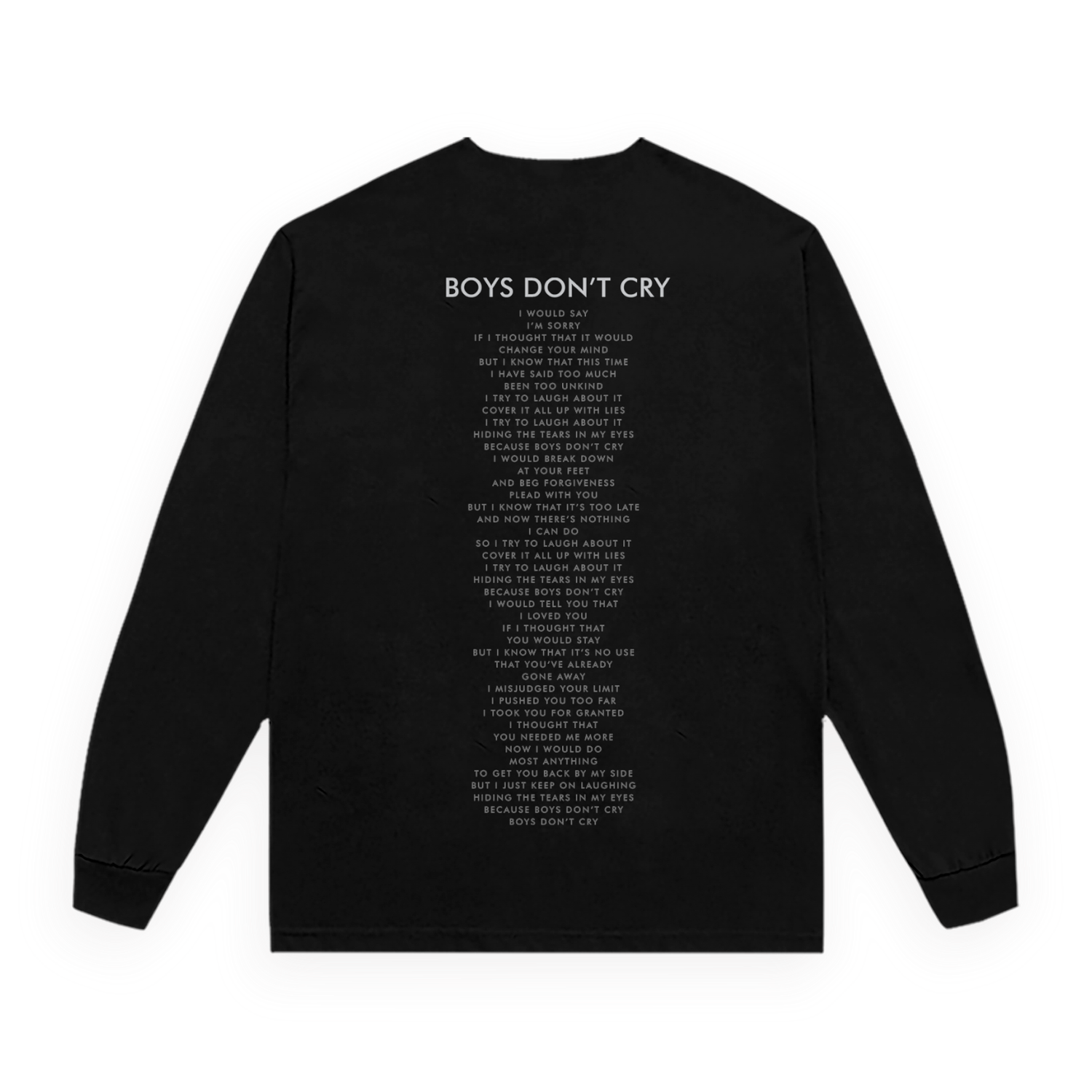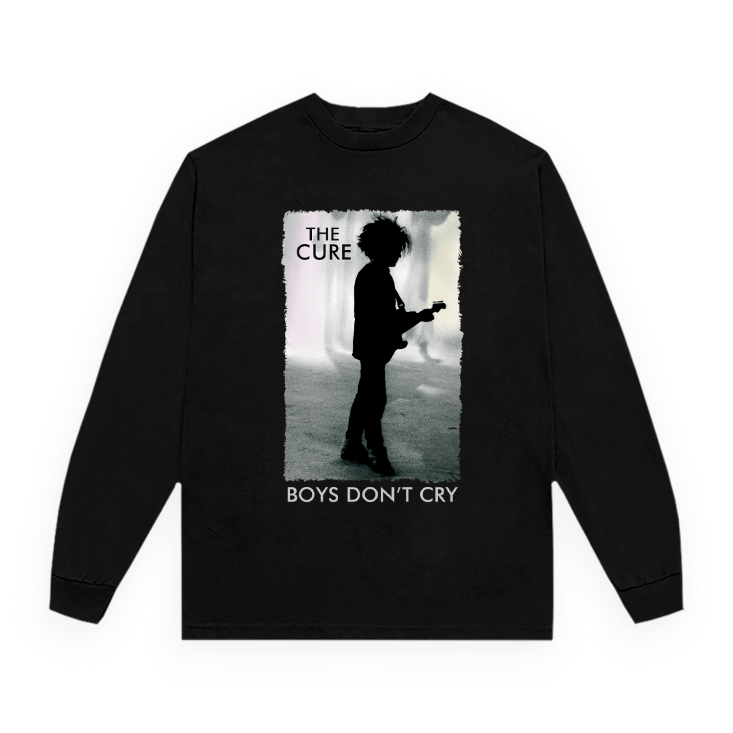 Classic fitting unisex long sleeve in black featuring a design inspired by The Cure's single "Boys Don't Cry" printed on the front and back. Constructed from 100% cotton.
