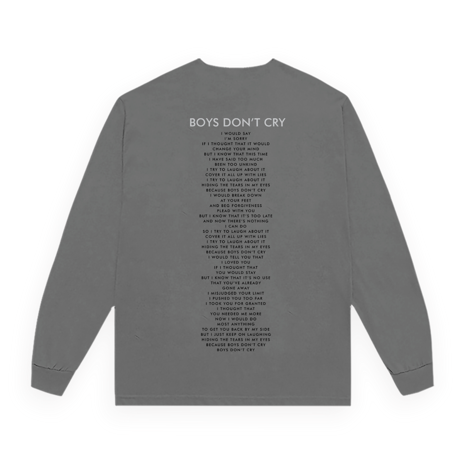 Classic fitting unisex long sleeve in charcoal featuring a design inspired by The Cure's single "Boys Don't Cry" printed on the front and back. Constructed from 100% cotton.