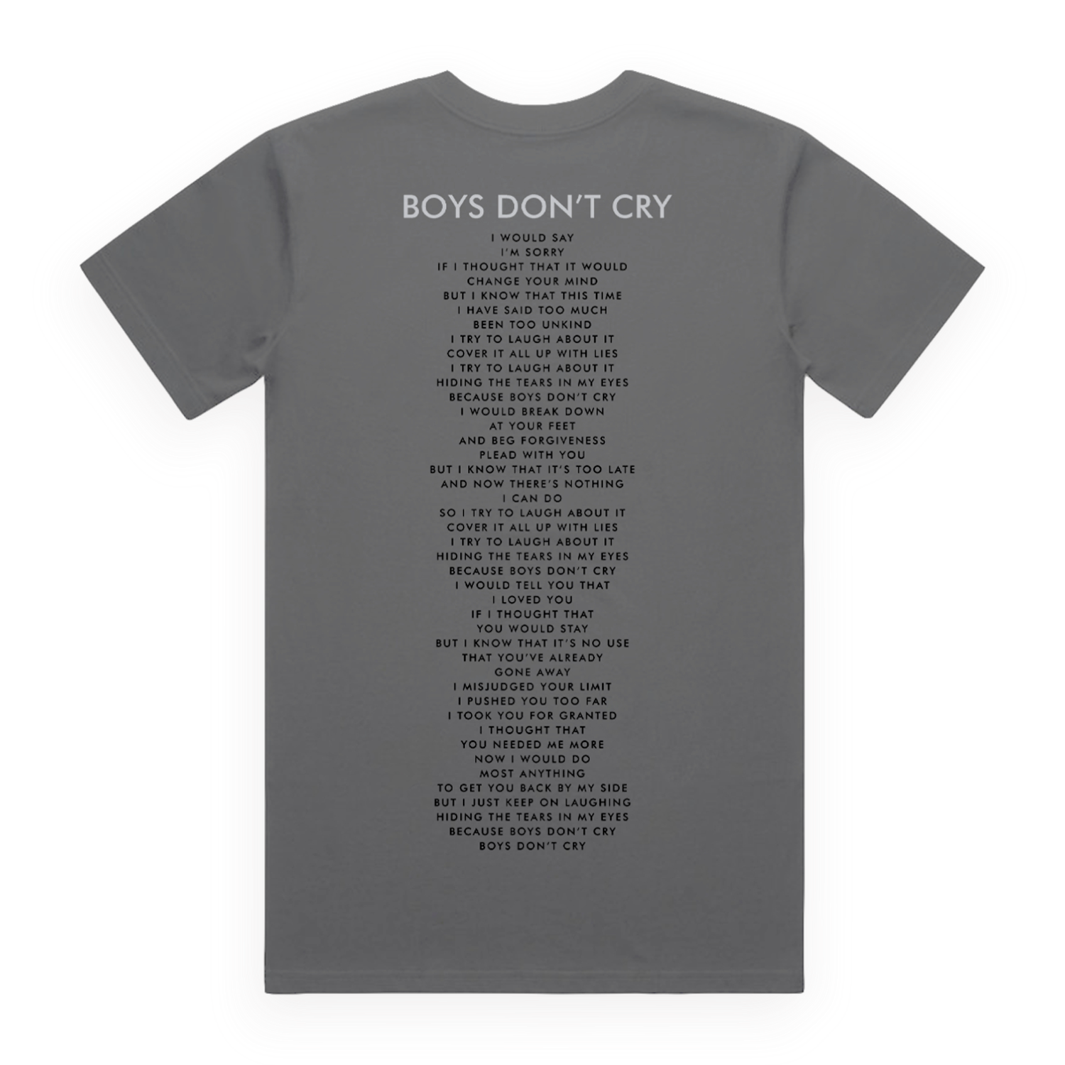 Classic fitting unisex v-neck tee in charcoal featuring a design inspired by The Cure's single "Boys Don't Cry" printed on the front and back. Constructed from 100% cotton.