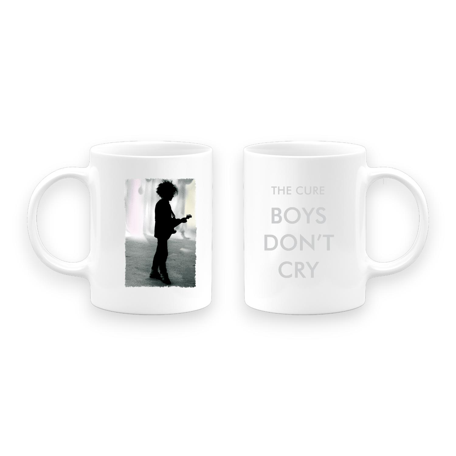 A classic 11oz coffee mug in white featuring a design inspired by The Cure's single "Boys Don't Cry".
