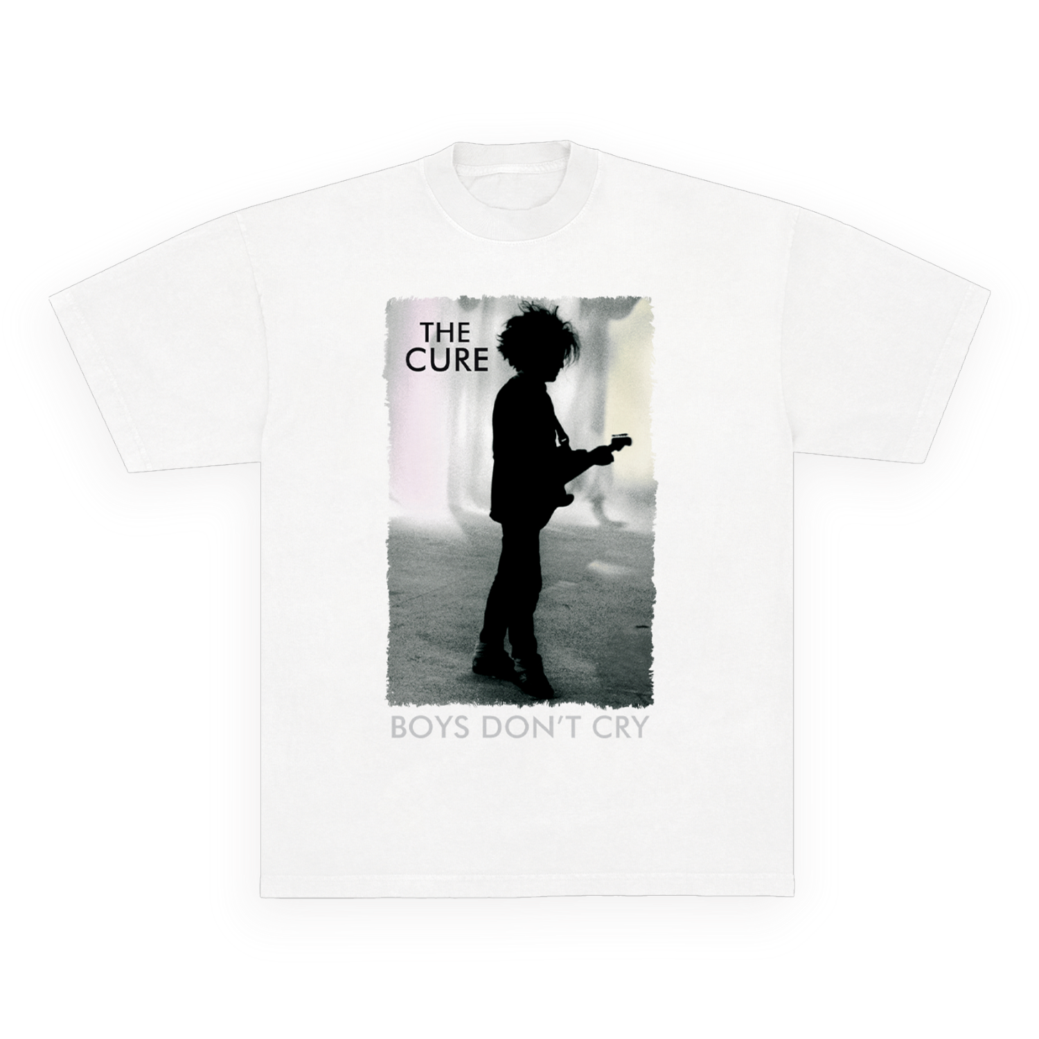 Classic fitting unisex t-shirt in white featuring a design inspired by The Cure's single "Boys Don't Cry" printed on the front and back. Constructed from 100% cotton.