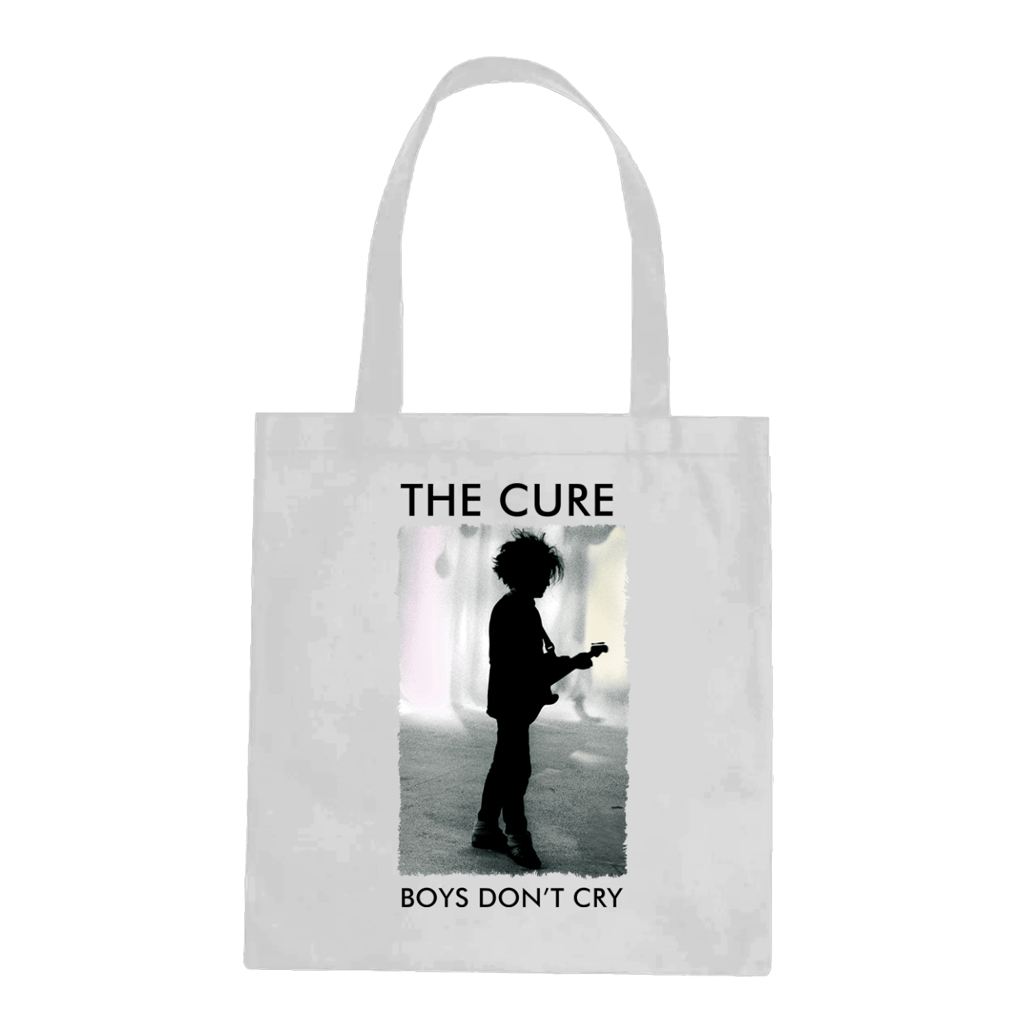 White tote bag featuring a design inspired by The Cure's single "Boys Don't Cry".