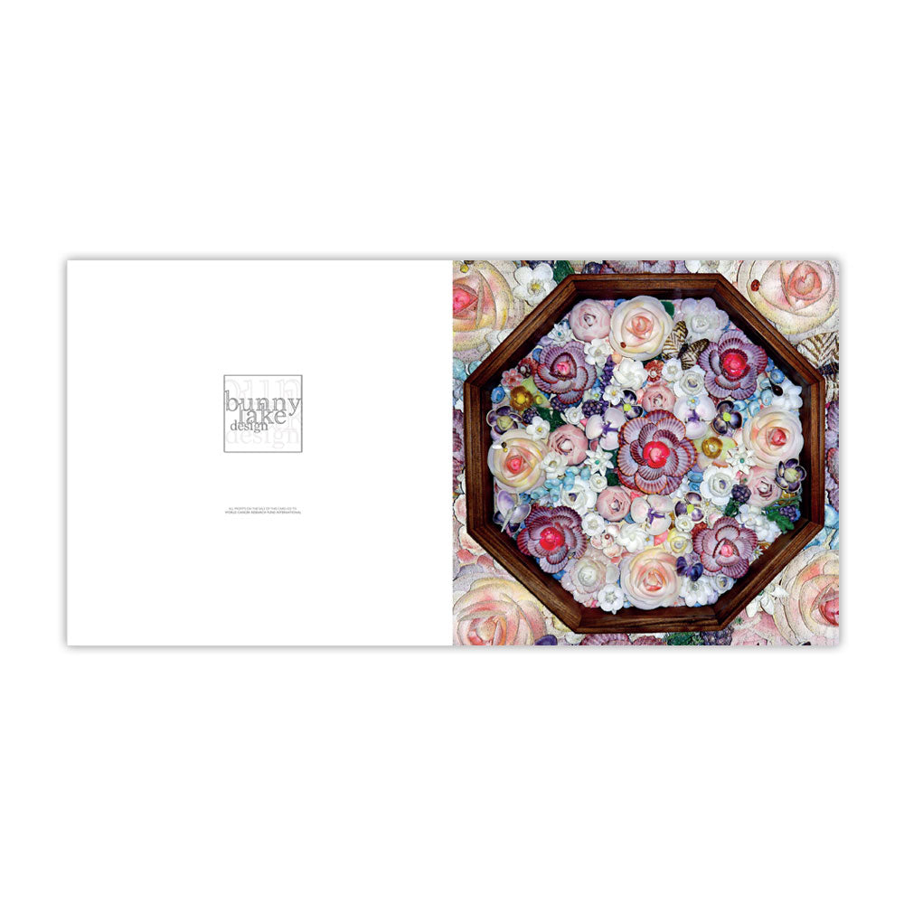 Pack of three pearlized greeting cards featuring variations of colourful shell flowers. Blank inside for message.
