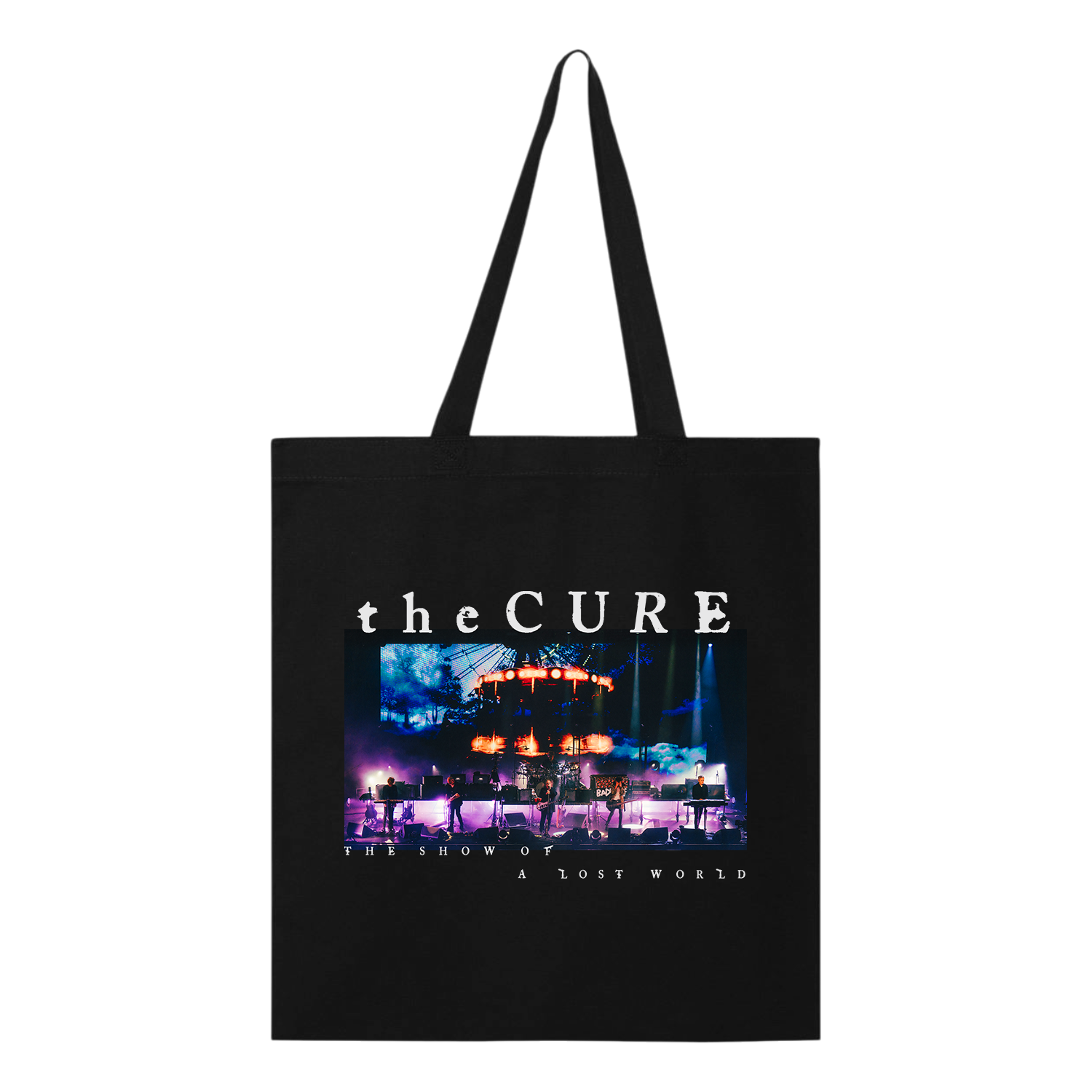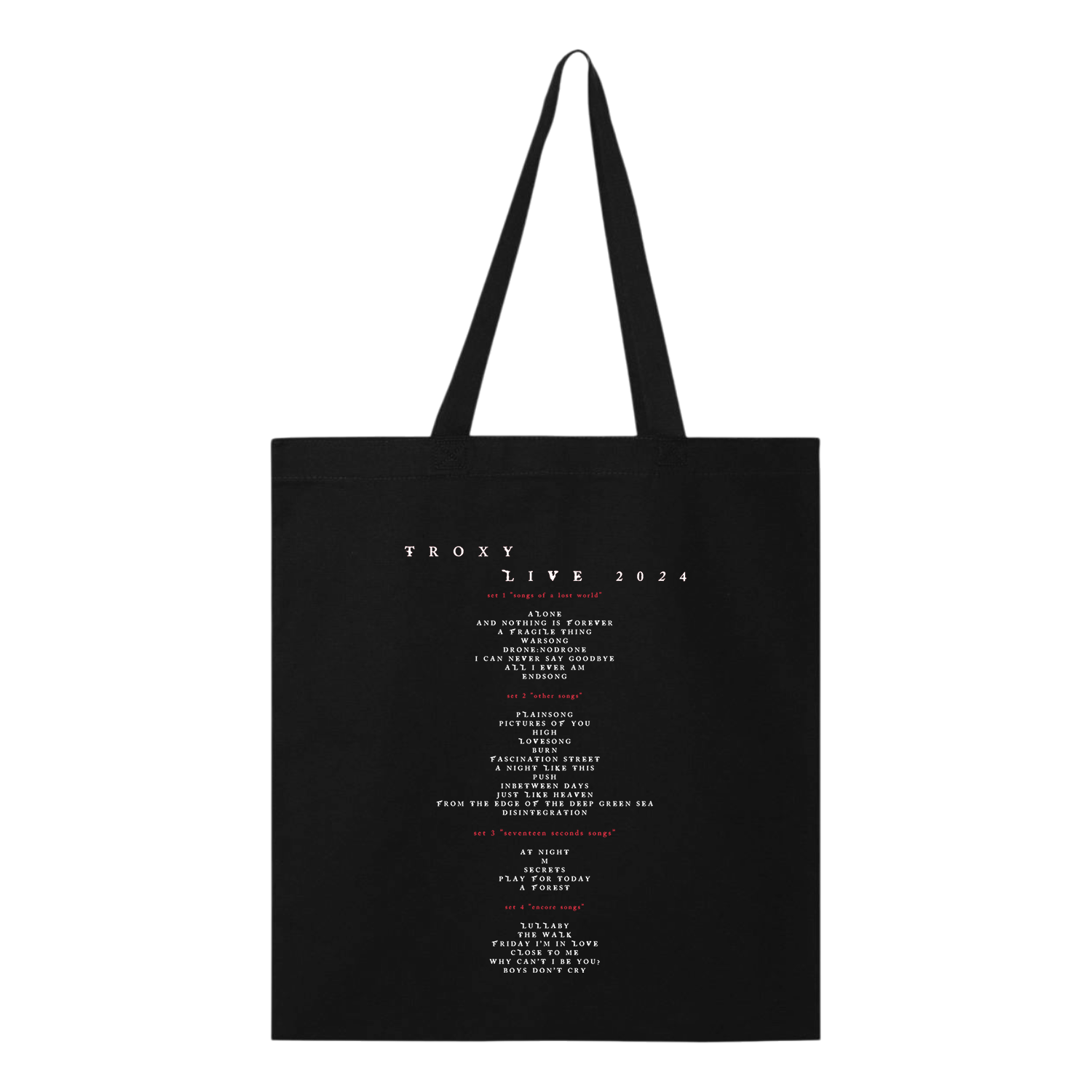 Black tote bag featuring a design inspired by The Show Of A Lost World: Troxy Live 2024 printed on both sides. 100% heavy cotton canvas. Tote bag measures 14"W x 16"H.